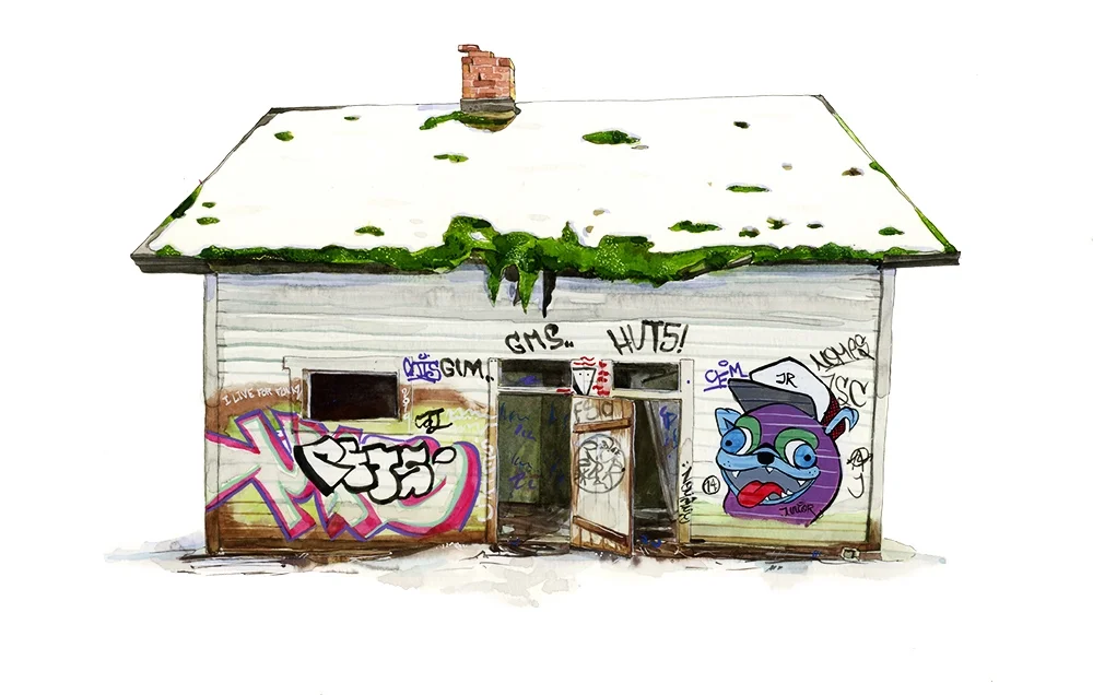 In the woods in Helsinki there is an abandoned town. The houses vary in both style and state of decomposition. They are decorated with bright, colourful street art which transforms the place from eerie desolation into a colourful installation. After some recent fires, the buildings are expected to be torn down. I visited in the early spring of 2016 when the weight of the winter snow had begun to collapse some of the roofs...